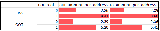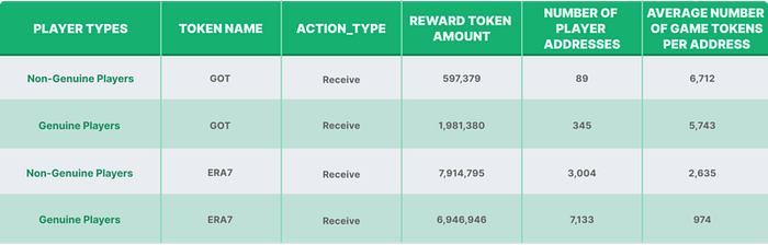 By tallying the transactions transferring game tokens from address 0 to player addresses as game reward tokens, it was discovered that both GOT and ERA7 game tokens have a higher average number of tokens for non-authentic players than for genuine players.