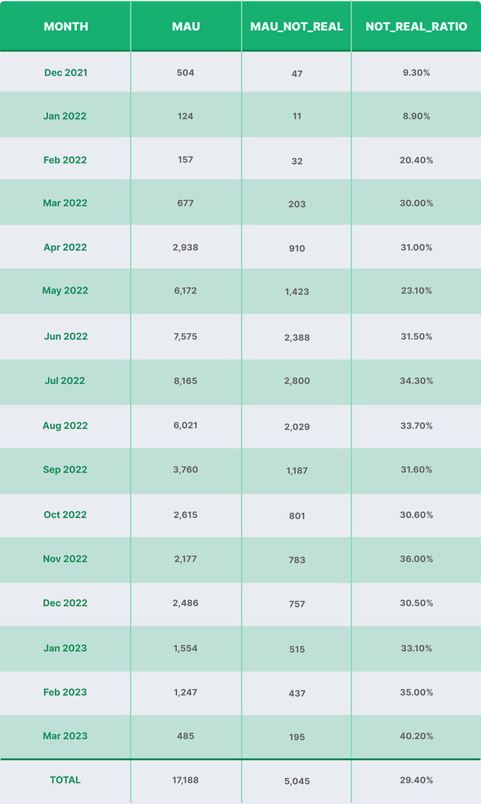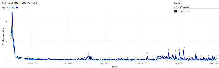 Among the approximately 16,000 player addresses observed as of March 7, 2023, around 4,900 were identified as non-authentic, representing 30% of the total. However, these non-authentic players, comprising less than one-third of the total, accounted for 39% of the interactions (920,000 times), with an average of 187 interactions per user, which is nearly 1.5 times greater than that of genuine players (average of 129 interactions per user).