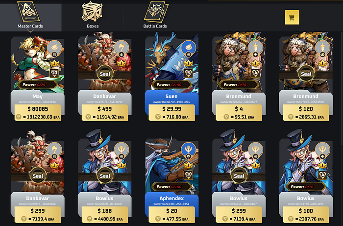 To acquire NFT Master Cards, players must purchase mystery boxes directly or trade with other players in the Marketplace. NFT Master Cards do not engage in battles themselves; they summon NFT Battle Cards that constitute the deck for frontline combat. After successfully acquiring NFT Master Cards, players must first unseal them before they can summon NFT Battle Cards. If the NFT Master Cards have reached their maximum summoning limit, players will need to expend ERA and GOT tokens as fuel to continue summoning.