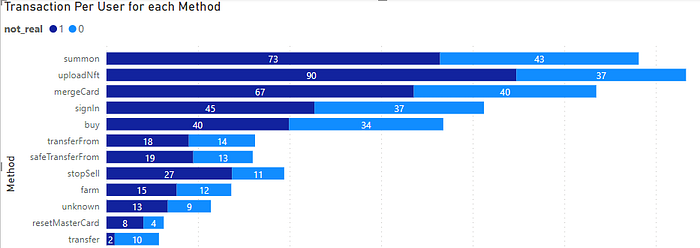 In terms of total operations, the most frequently utilized methods in the game include Sign In (login), Upload NFT (list NFT for sale), Buy (purchase in Marketplace), Summon (batch summon, exchange Master Card for Battle Card), Merge Card (combine Battle Cards for upgrades), and Farm (staking to earn ERA). Both non-authentic and genuine players display a similar distribution of the top methods they employ.