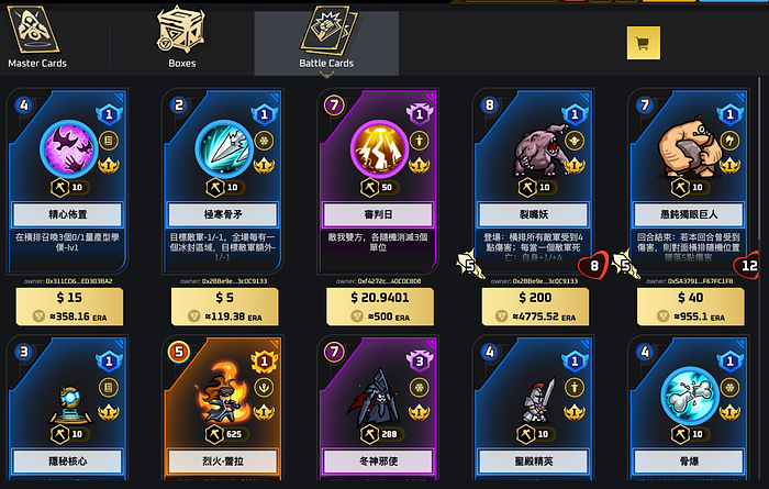 Era7 includes two categories of cards: Master cards (hero character cards) and Battle Cards (magic cards and monster cards summoned by heroes). Players require a minimum of 30 battle cards to initiate a battle, and the total card count in the game is projected to exceed 1,000. Both Master Cards and Battle Cards are NFTs.