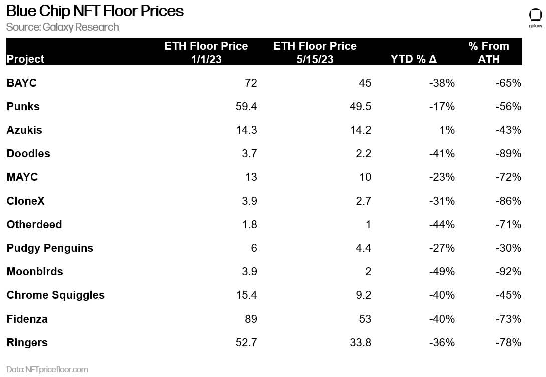 Despite the decreasing floor prices for well-known NFT collections, blue chip projects have demonstrated some resilience during the bear market. Collections such as Bored Ape Yacht Club, Doodles, Mutant Ape Yacht Club, CloneX, and Moonbirds have all fallen over 64% from their all-time highs. Moonbirds has been the most affected, down 92% and 49% year to date.