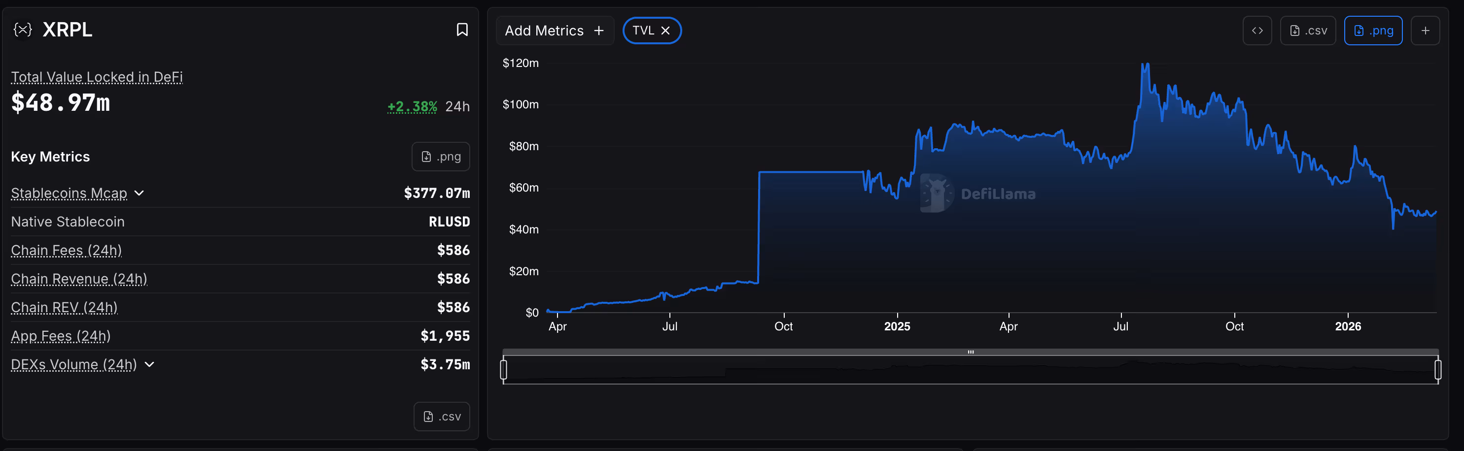 The DeFi metrics illustrate this contrast starkly. DeFiLlama reports that XRPL’s total value locked stands at $47.54 million. This represents the entirety of the DeFi ecosystem on a blockchain whose native token boasts an $84 billion market cap.