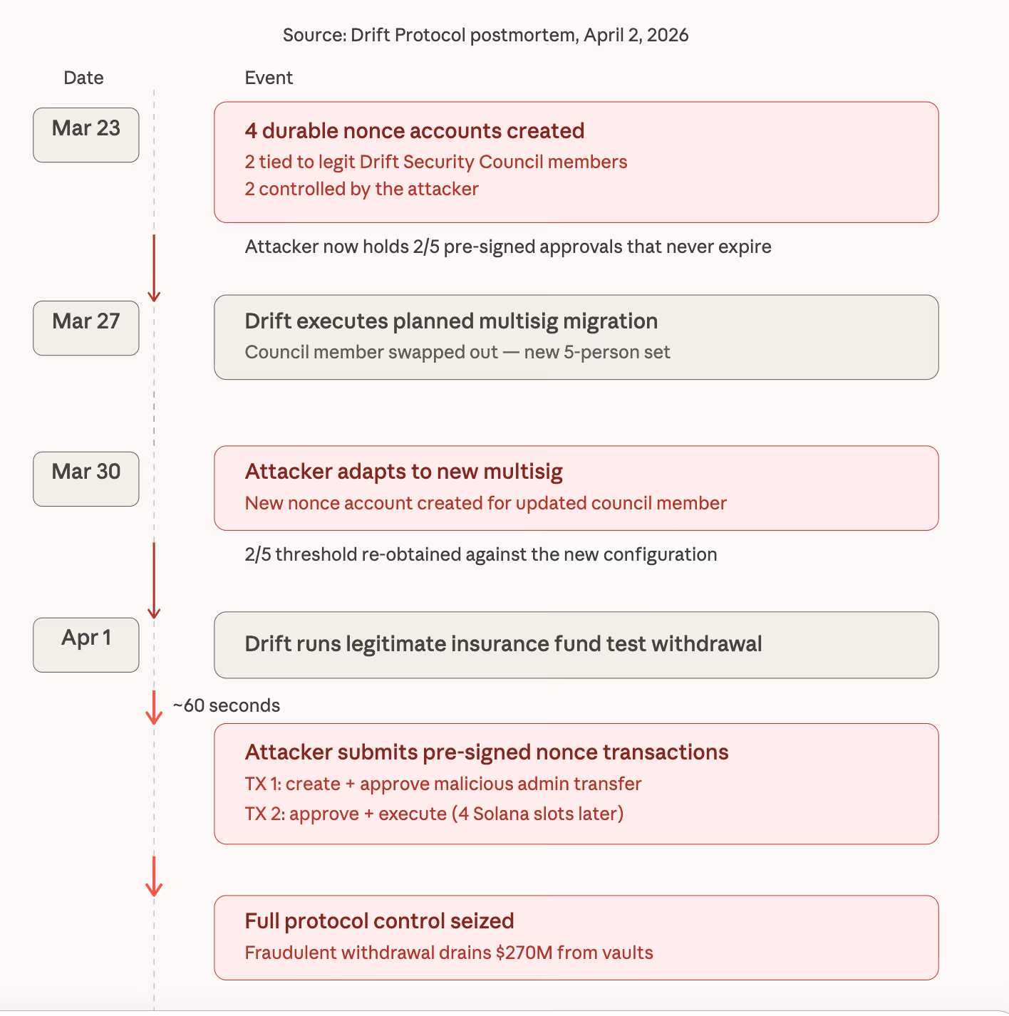 On March 27, Drift conducted a planned Security Council migration to replace a council member. The attacker adjusted their strategy. By March 30, a new durable nonce account was created, associated with a member of the updated multisig, indicating that the attacker had regained the necessary two-of-five approval threshold under the new configuration.