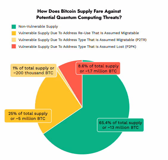 - Approximately 35% of the Bitcoin supply is located in address types that are theoretically at risk from potential future quantum attacks, although around 1.7 million BTC is presumed to be already lost.