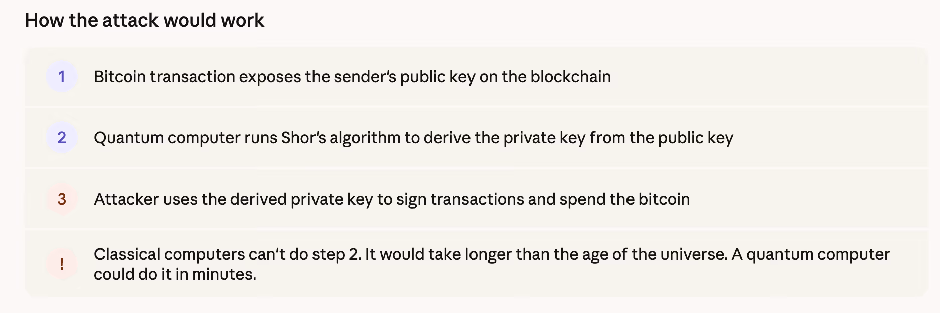 A sufficiently robust quantum computer executing Shor’s algorithm could extract private keys from public keys, enabling an attacker to utilize any bitcoin associated with a public key that has been revealed on the blockchain.