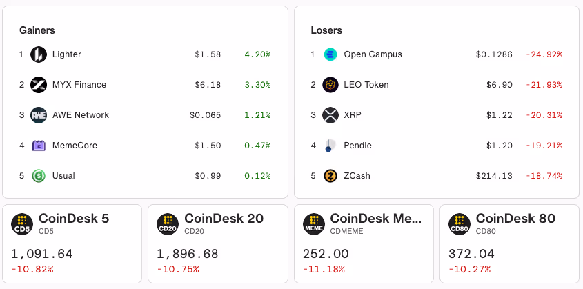 Nearly all CoinDesk index prices, covering major tokens and memecoins, have decreased by more than 10% in the past 24 hours.