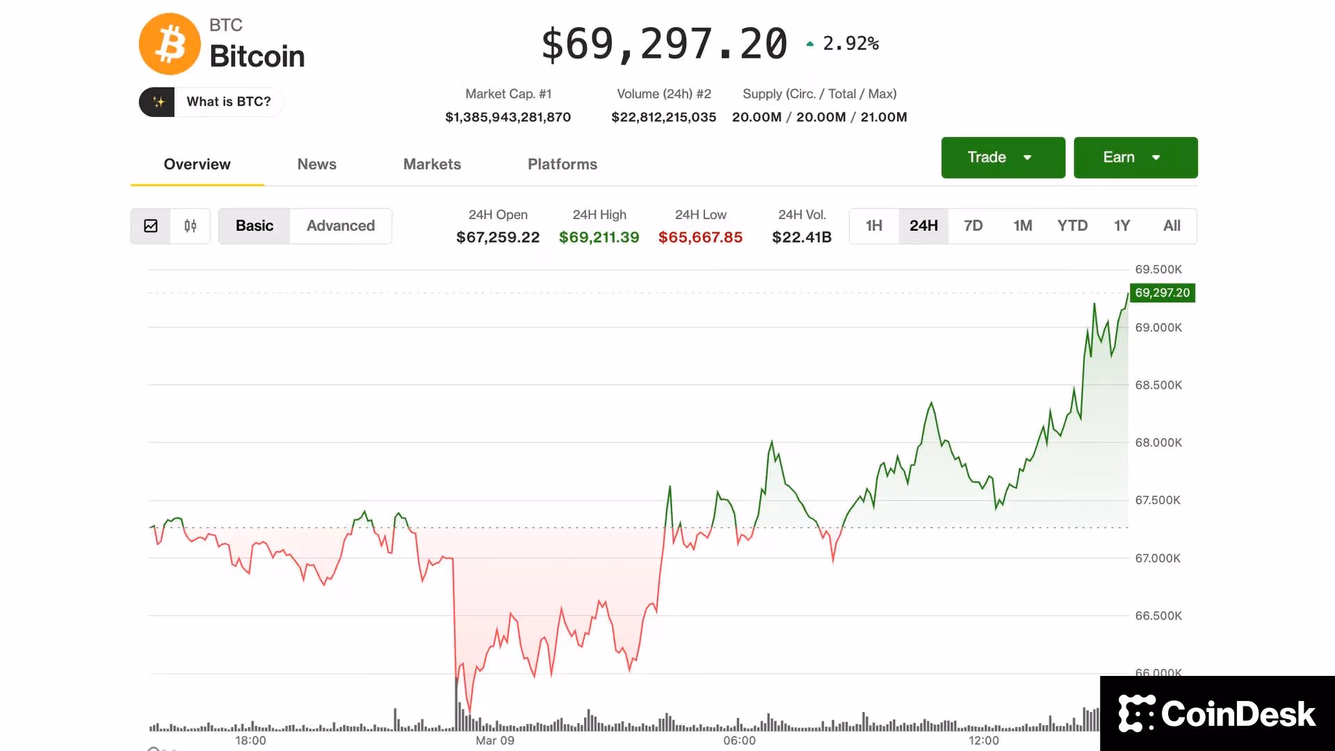 Bitcoin (BTC) price on Monday, March 9 (CoinDesk)