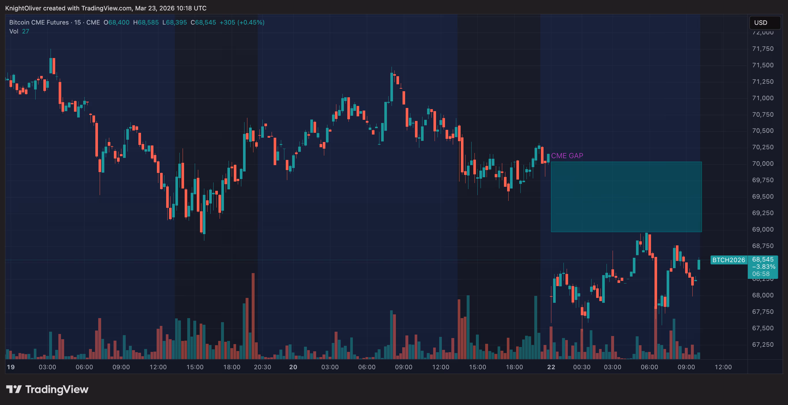 - Bitcoin dropped to $68,200 following a weekend selloff associated with the conflict in Iran, resulting in a CME gap near $70,000.