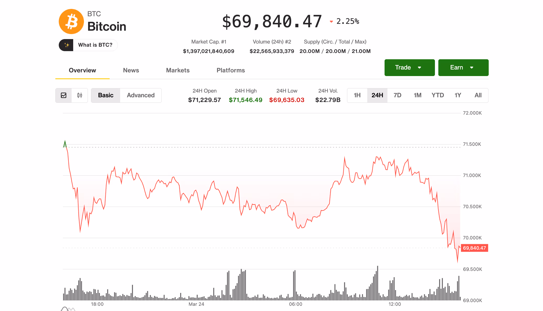 After hovering around $71,000 earlier in the session, BTC dropped to approximately $69,600 during early U.S. trading hours, mirroring a general reversal in risk assets. Ether (ETH), Solana (SOL), and XRP (XRP) also decreased by 2%-3% over the past 24 hours.