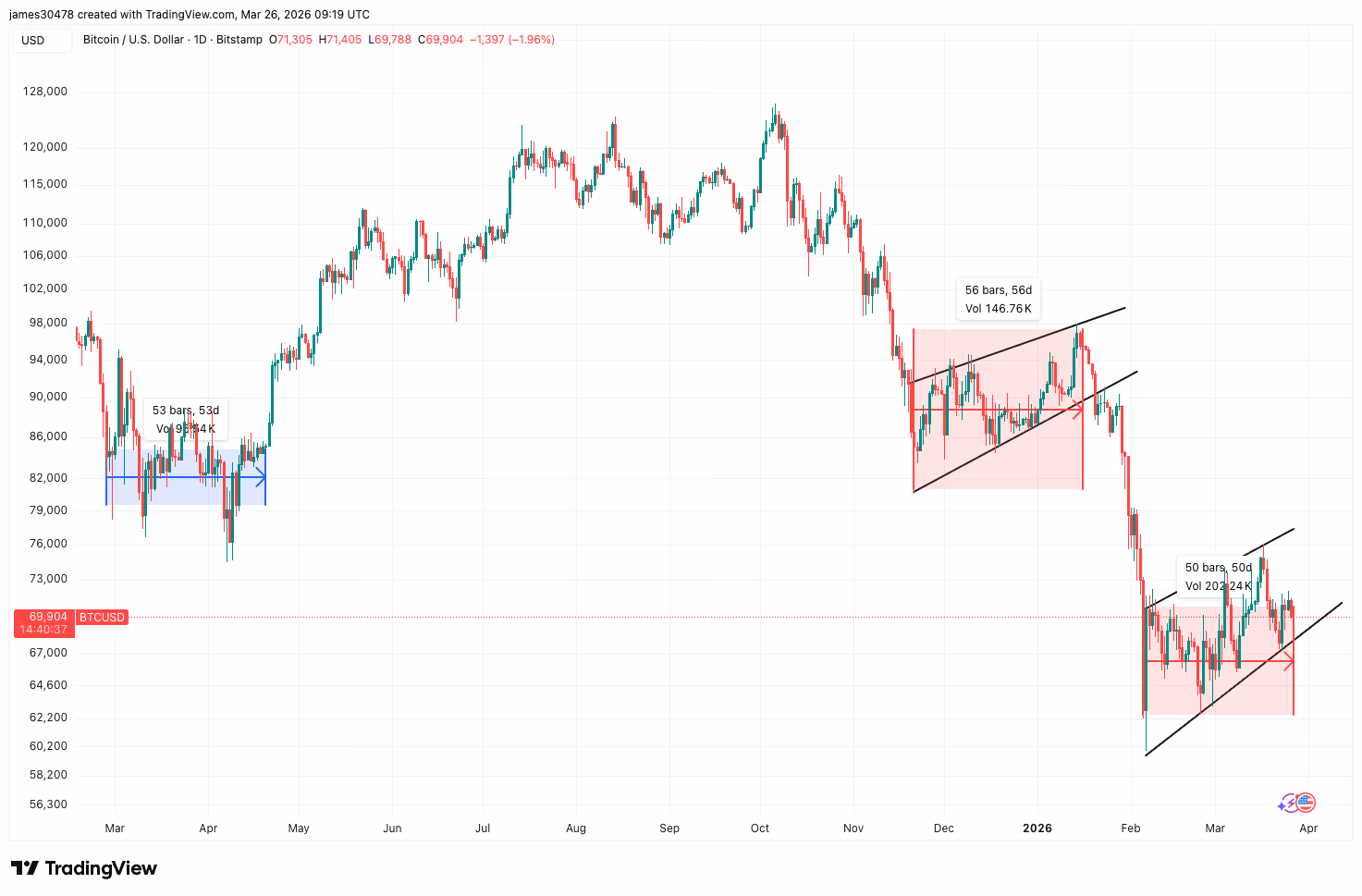 - The situation in 2026 differs from 2022, with robust support established between $50,000 and $70,000, and considerable accumulation supporting the current range.