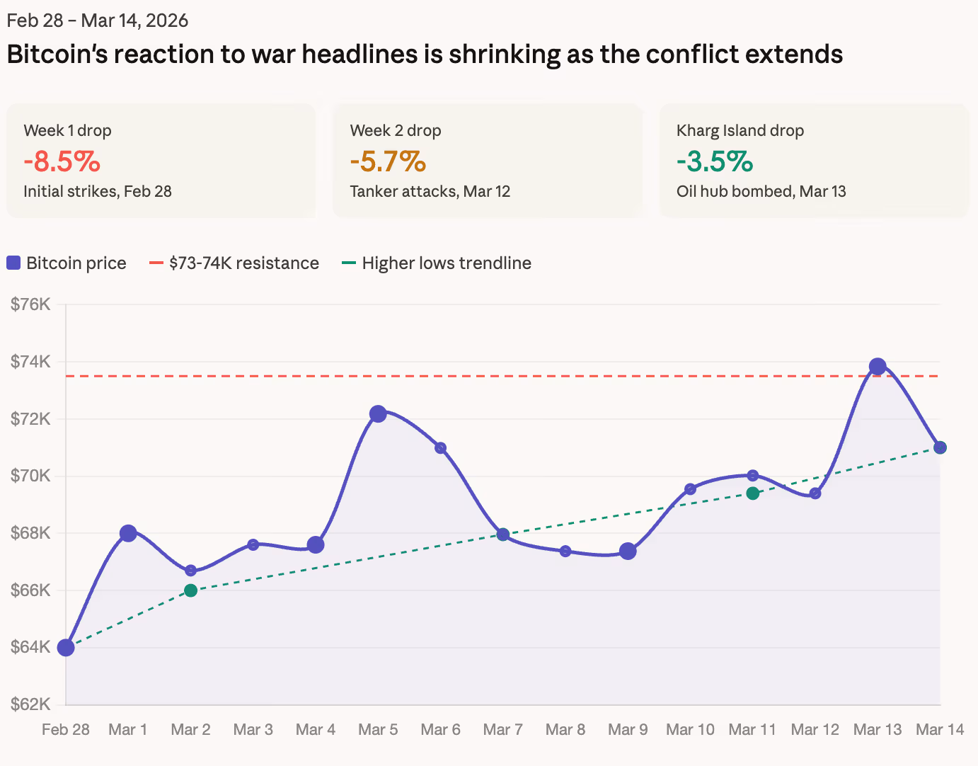 On February 28, the day of the initial attacks, it hit a low of $64,000. On March 2, after Iran’s retaliatory missiles targeted Gulf states, the new low was $66,000. By March 7, following a week of ongoing conflict, the low had risen to $68,000. After the tanker incidents on March 12, it maintained a floor at $69,400. Following the events at Kharg Island on Saturday, the low reached $70,596.