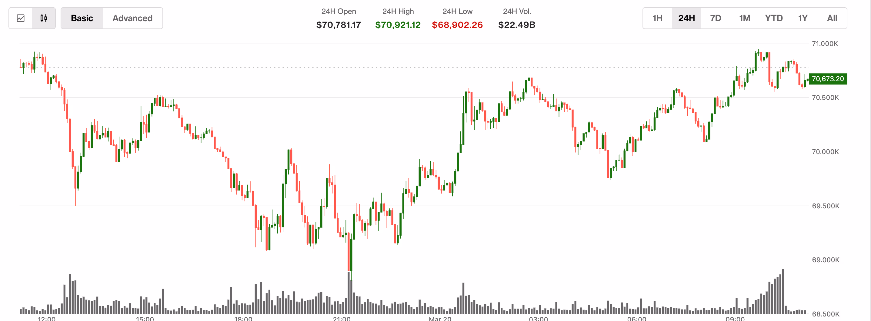 BTC, the leading cryptocurrency, rose to $70,800, increasing by over 1% on the day, continuing its recovery from overnight lows below $68,900, according to data from CoinDesk. Other prominent cryptocurrencies, such as ether (ETH), XRP (XRP), and solana (SOL), recorded smaller increases of less than 1%, trailing behind bitcoin.
