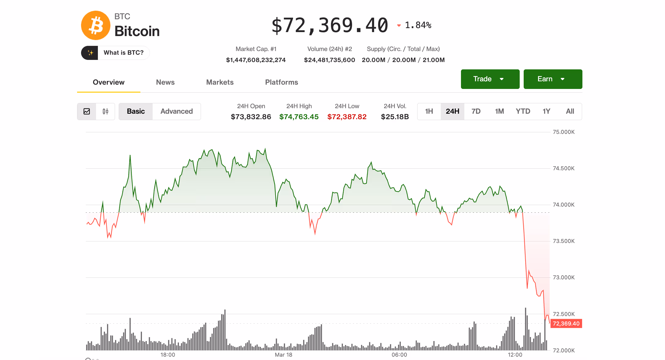 - After trading near $74,000 for most of the previous 24 hours, bitcoin swiftly dropped to $72,500 in response to reports of intensified assaults on Iran’s energy sector and an unexpectedly robust February PPI report.
