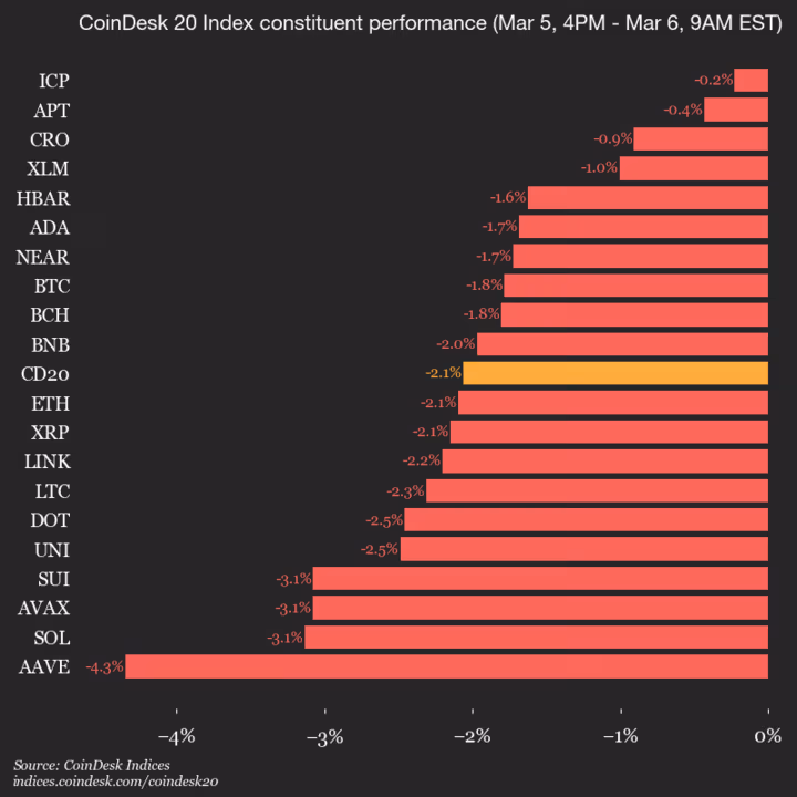 CoinDesk 20 performance report: Aave declines by 4.3% as all index components experience a downturn.