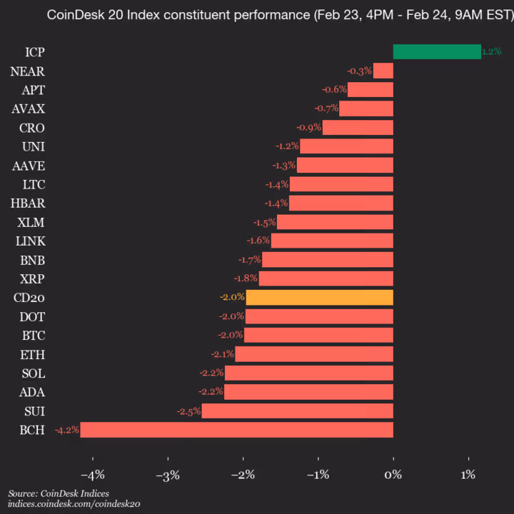 CoinDesk 20 performance report: index decreases by 2% as almost all components drop.