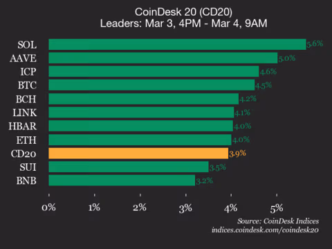 CoinDesk 20 performance report: Solana (SOL) rises 5.6%, driving index upward