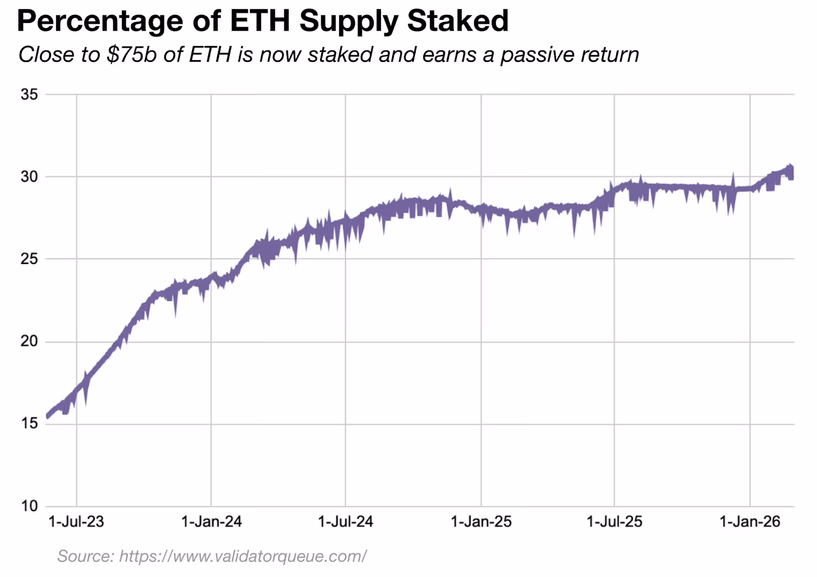 Institutions have taken note. Following the SEC’s provision of regulatory clarity regarding staking in U.S.-registered funds last year, nearly twenty staking-linked ETFs and ETPs have either launched or been filed, including BlackRock’s iShares Staked Ethereum Trust and offerings from VanEck, Grayscale, and Fidelity—more than in all prior years combined. Morgan Stanley, which oversees approximately $8 trillion in client assets, submitted an application in February for a national trust bank charter from the Office of the Comptroller of the Currency (OCC) to provide crypto custody and staking services to its investment clientele.