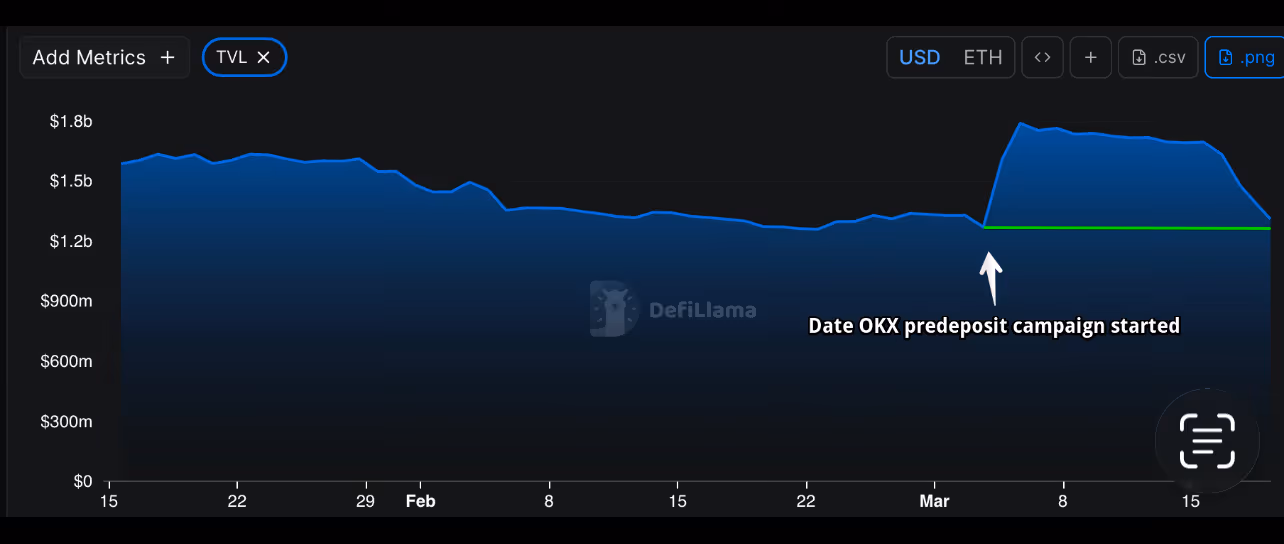 The primary factor, according to Gauntlet, was the ending of OKX’s pre-deposit campaign on the DeFi-oriented blockchain, Katana. Pre-deposit campaigns — where users are incentivized to allocate capital prior to a protocol launch — can create significant TVL increases that quickly reverse once the campaign concludes or a token airdrop occurs. The data supports this observation: Gauntlet’s TVL sharply increased around March 2 before declining just as quickly.