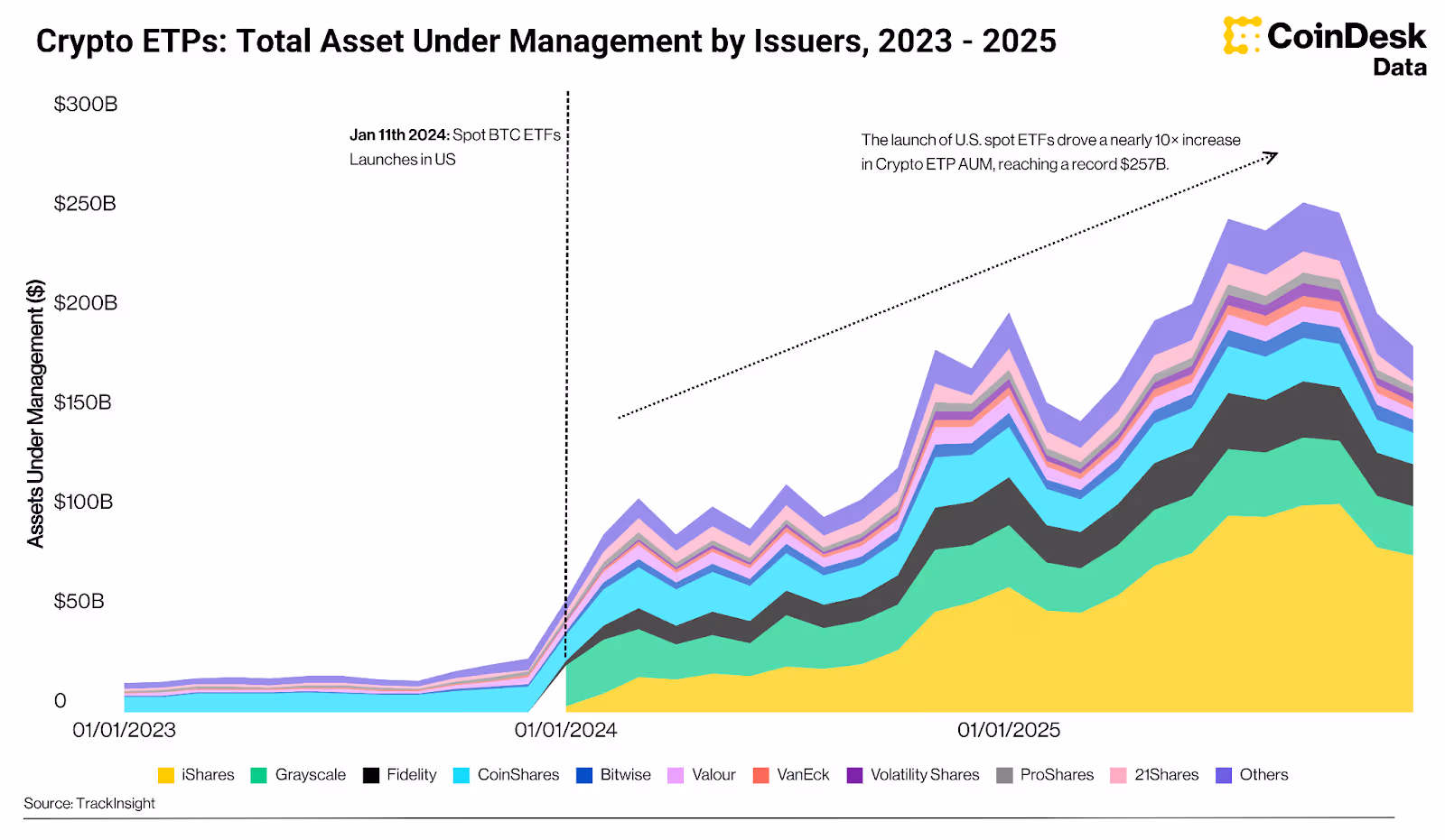The increase in AUM has primarily been fueled by the introduction of U.S. spot bitcoin ETFs in January 2024. The impact was immediate. This launch cycle propelled crypto ETP assets significantly higher and established a product category that now fits within the same ETF allocation frameworks utilized across equities, fixed income, and commodities.