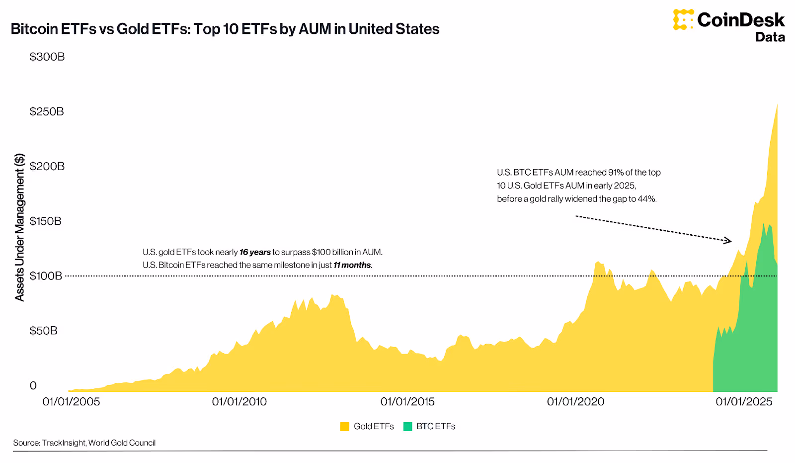The rate of adoption has been exceptionally rapid when compared to previous ETF cycles. U.S. bitcoin ETFs reached $100 billion in assets within a mere 11 months, while U.S. gold ETFs took nearly 16 years to exceed the same figure. By early 2025, bitcoin ETFs had achieved 91% of the top 10 U.S. gold ETFs by AUM, although gold’s subsequent surge widened the disparity. This reflects less on relative value and more on the speed at which bitcoin has been integrated into institutional distribution channels once the wrapper was introduced.