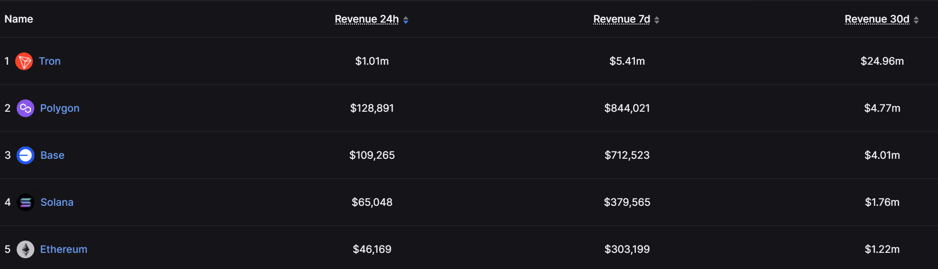 On a revenue basis, the gap widens even further. Ethereum placed fifth in 30-day protocol revenue at $1.22 million, lagging behind Tron, Polygon, Base, and Solana. Base, an Ethereum layer-2 network developed by Coinbase, generated approximately three times Ethereum’s protocol revenue during the same timeframe.
