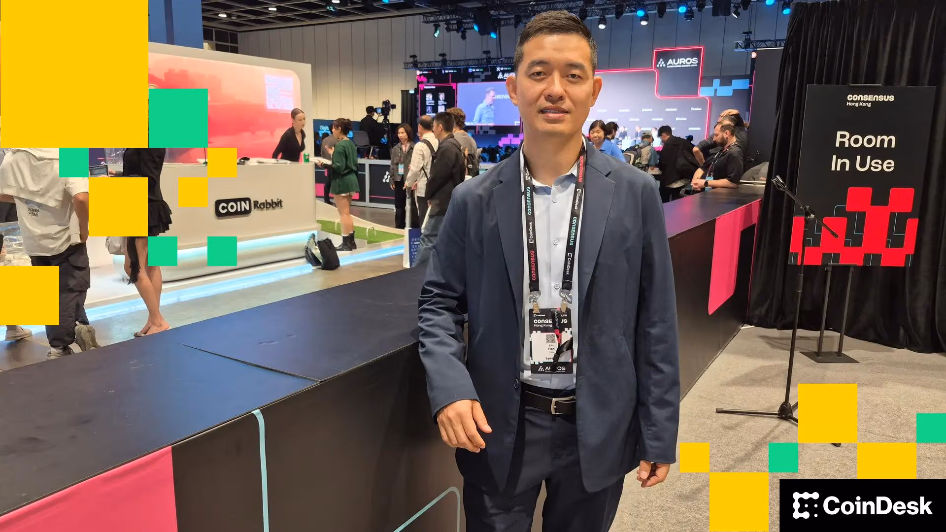 Lin Han of Gate discusses his perspectives in an exclusive interview with CoinDesk at Consensus Hong Kong 2026. (Photo: Olivier Acuna/Modified by CoinDesk)
