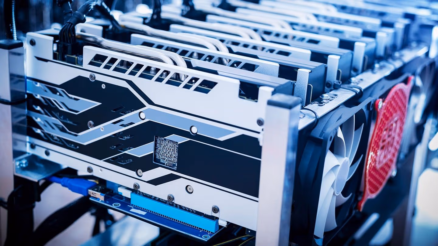 Rack of bitcoin mining machines (Shutterstock)