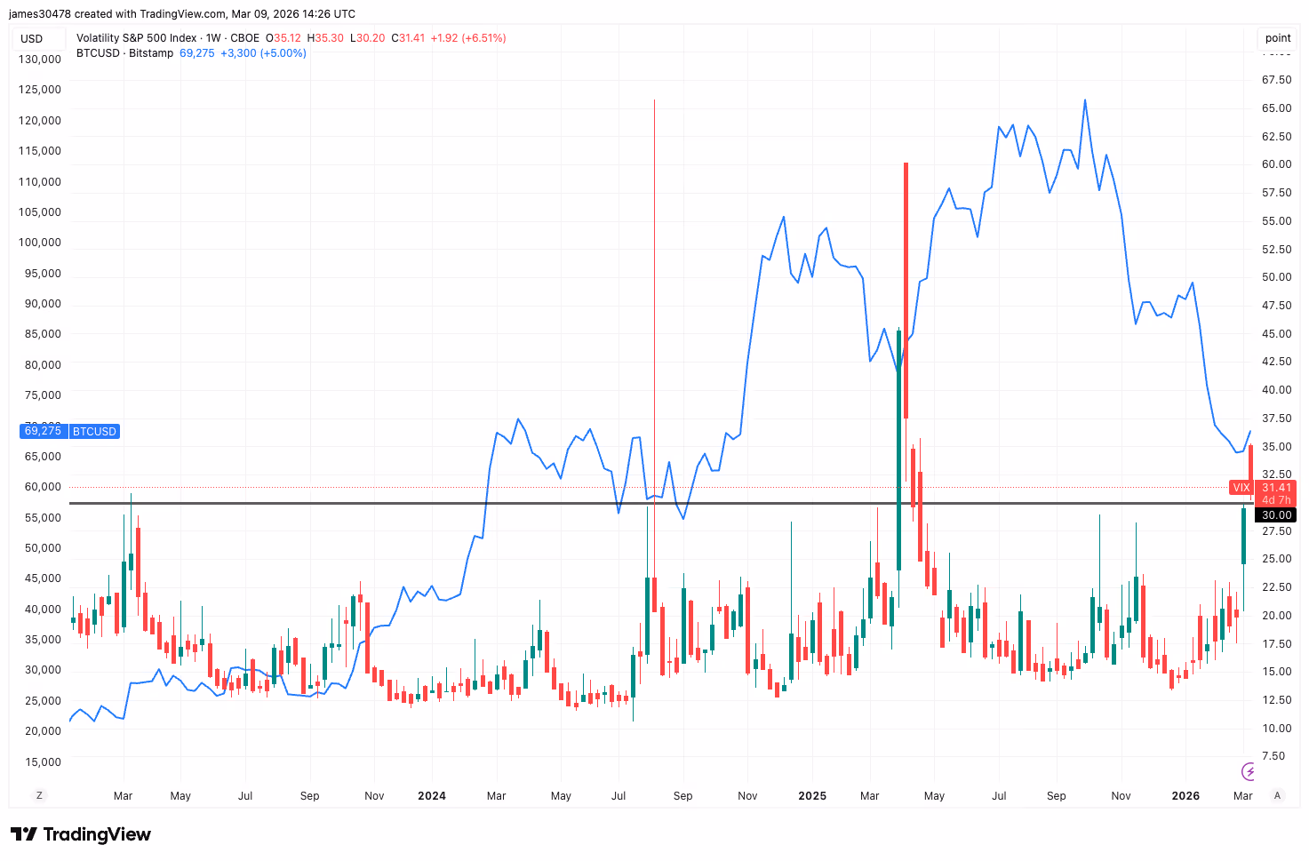 This divergence may suggest that the cryptocurrency markets anticipated the stress currently affecting traditional finance, although a VIX near 30 implies that volatility in traditional markets may not yet be resolved.