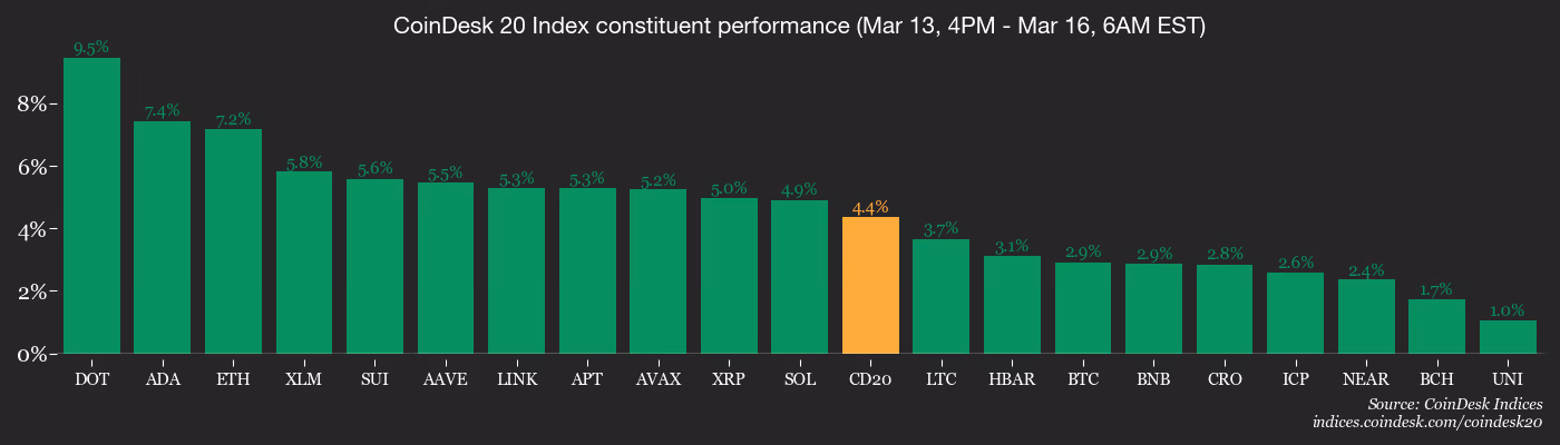 Among the major cryptocurrencies, bitcoin increased by over 2% in a 24-hour period, briefly exceeding $74,300 early Monday, marking its highest point since early February. Other cryptocurrencies such as XRP (XRP) and solana (SOL) rose by over 4%, while ether (ETH) climbed by 7%. The CoinDesk 20 Index saw a nearly 4% increase.