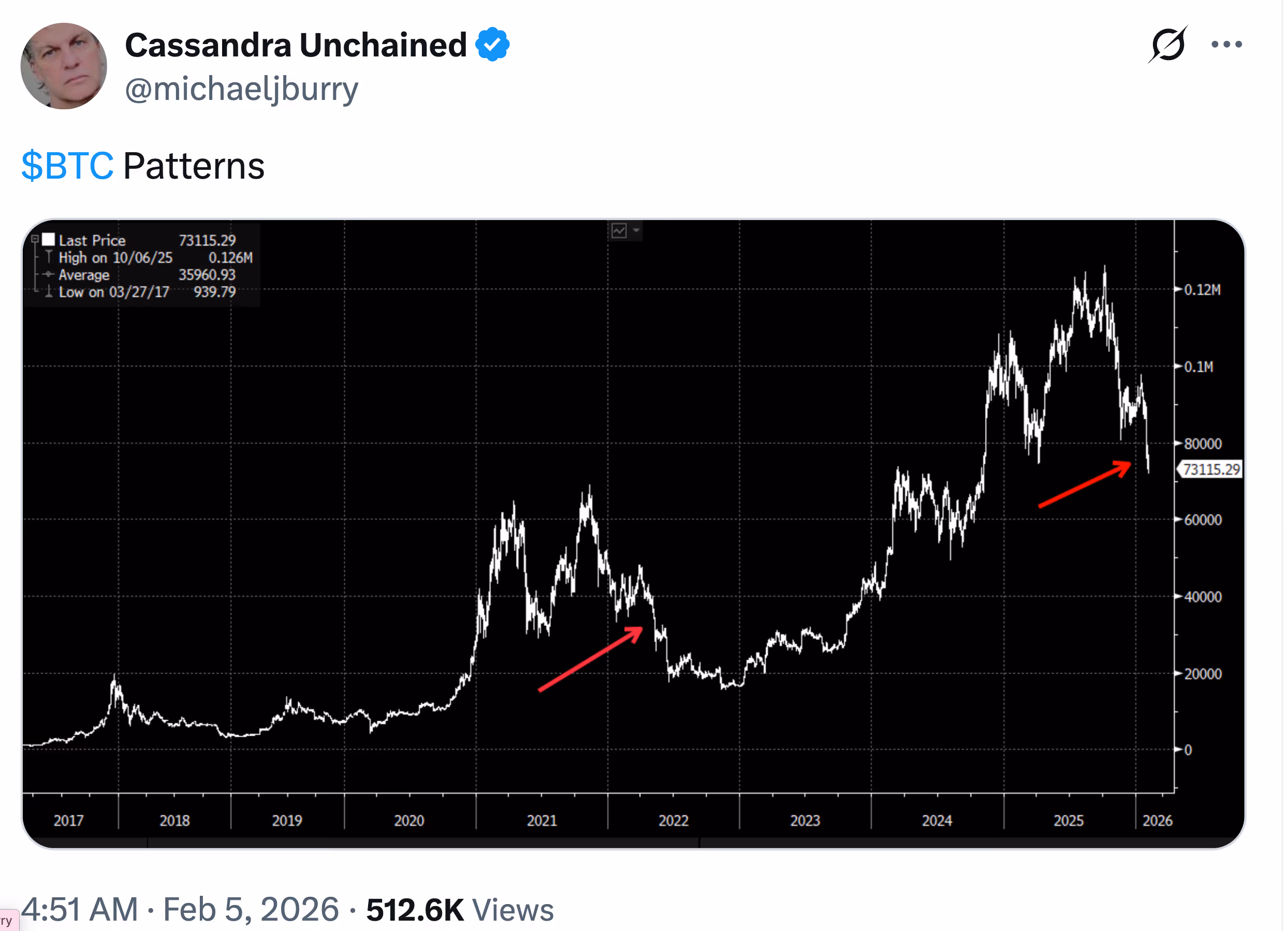 In a post on X early Thursday in Asian hours, Burry pointed out the similarities between BTC‘s decline from the October peak of $126,000 to $70,000 and Bitcoin’s drop in late 2021 and 2022, asserting that the patterns align closely so far.