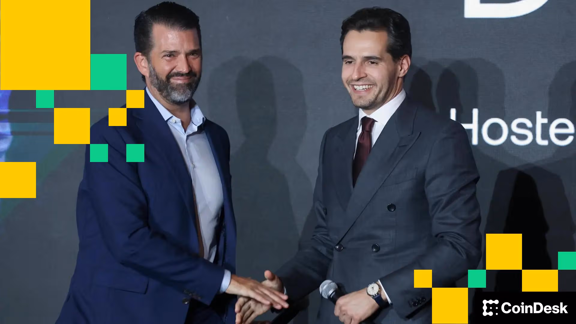 Nexo, represented by Co-Founder Antoni Trenchev, who is photographed here with Donald Trump Jr., attributes its return to the U.S. to the crypto-friendly policies of the Trump Administration. (Photo: Nexo/Modified by CoinDesk)