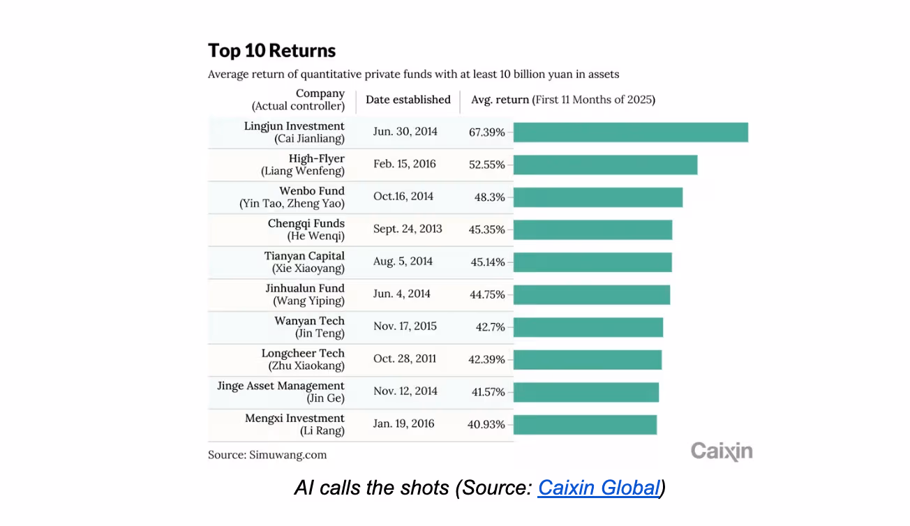 AI is beginning to yield substantial returns for quantitative funds and high-frequency traders. The AI quant hedge fund Ningbo’s High-Flyer reported an average return of 52.55% in 2025, placing it at the forefront of the industry’s leaders.
