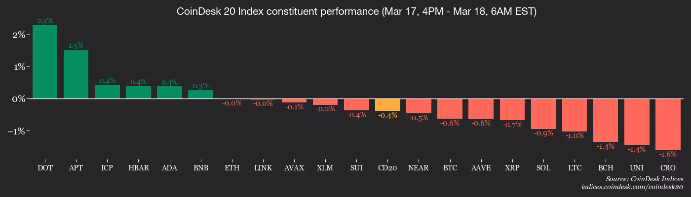 The wider market continues to reflect movements of the largest cryptocurrency. The CoinDesk 20 Index has remained relatively stable over the past 24 hours, with similar activity seen in ether (ETH), XRP (XRP), solana (SOL), and other major cryptocurrencies. In contrast, smaller coins like SIREN, M, and KAS have each risen by approximately 10%.