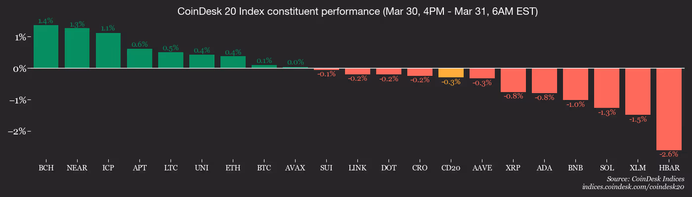 - CoinDesk 20 is down 1.1% at 1,893.79 (24hrs: -2.15%)