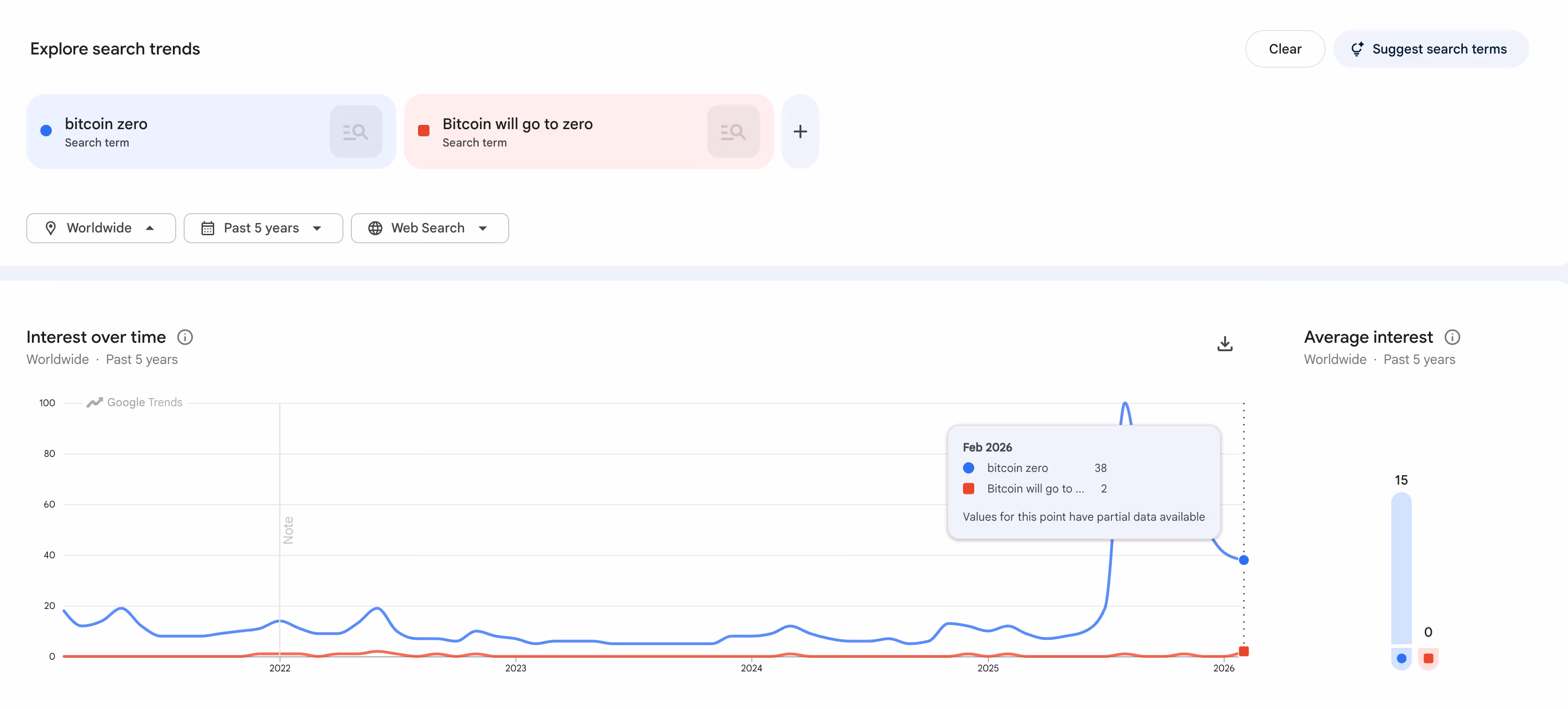In February, Google searches in the U.S. for “bitcoin zero” surged to a peak of 100 on the company’s relative interest scale, aligning with bitcoin’s descent toward $60,000 after experiencing a decline of over 50% from its all-time high in October.