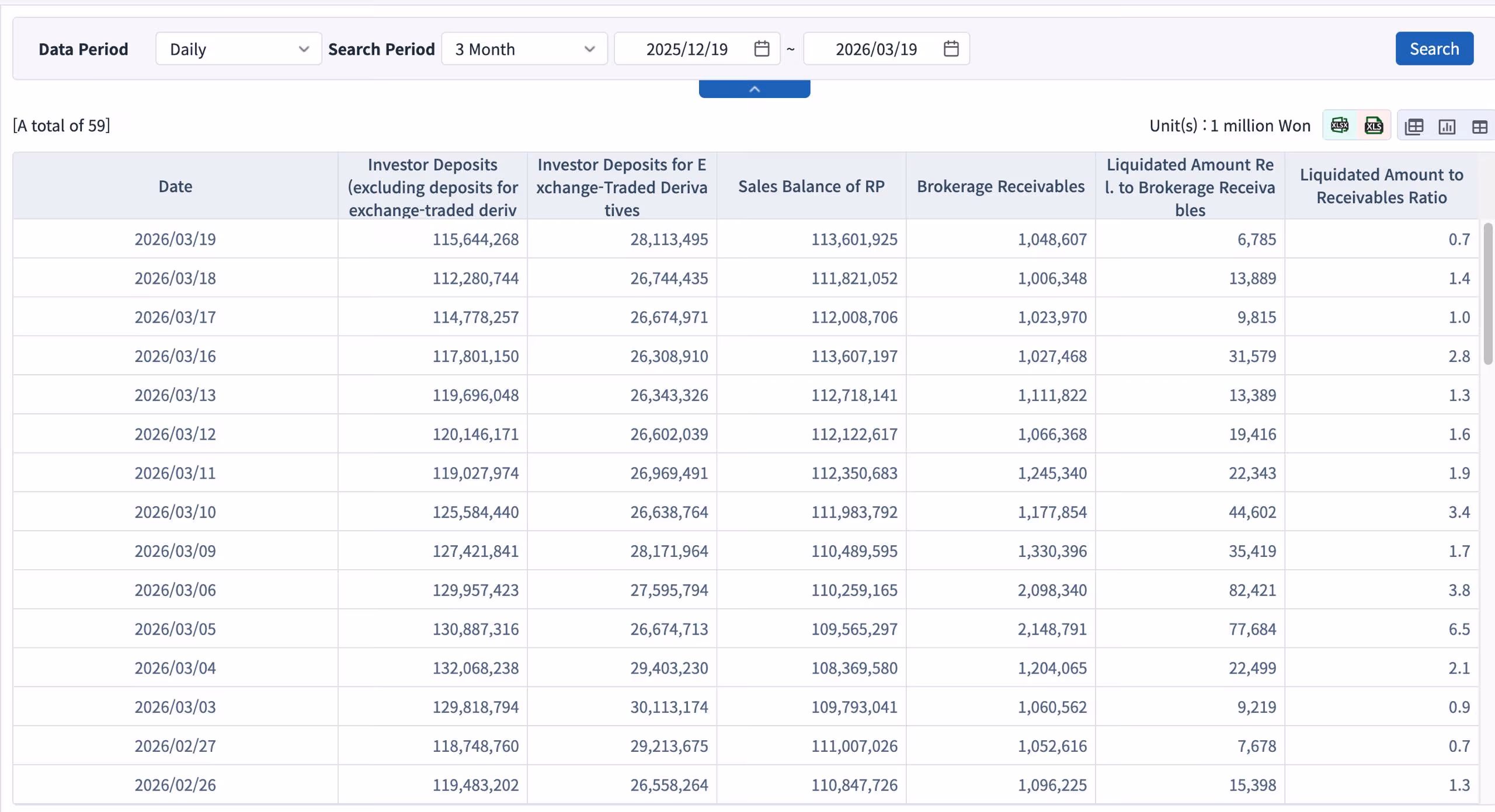 This trend is apparent in brokerage statistics. Investor deposits, which serve as an indicator of cash available for stock purchases, decreased from approximately ₩131 trillion ($86 billion) in early March to around ₩112 trillion ($74 billion) following the mid-month currency fluctuation, suggesting that capital was actively invested in equities as stablecoin reserves dwindled. Deposits have since started to stabilize, indicating that new inflows are replenishing the buying power.