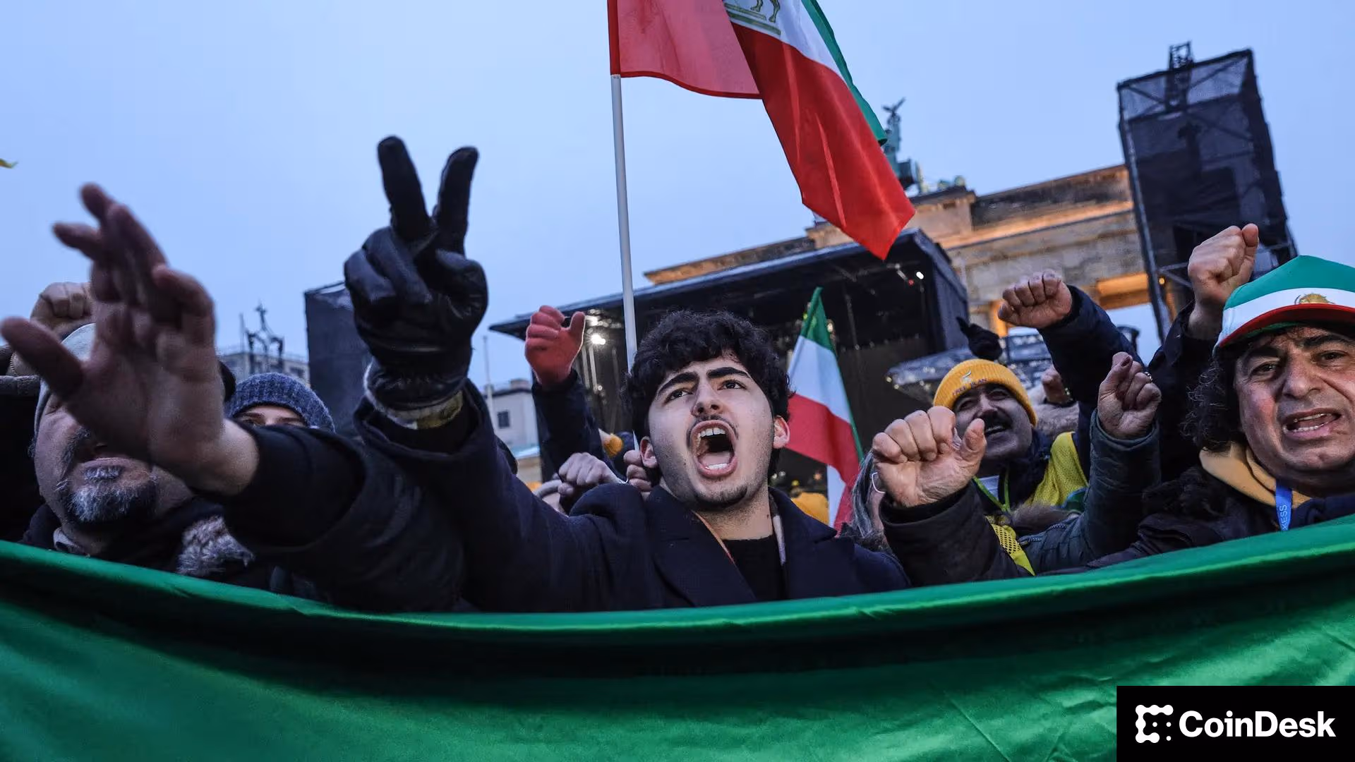 People waving pre-1979 Iranian flags gather to protest for the overthrow of the current Iranian regime in front of the Brandenburg Gate, on February 7, 2026 in Berlin, Germany. (Photo by Omer Messinger/Getty Images)