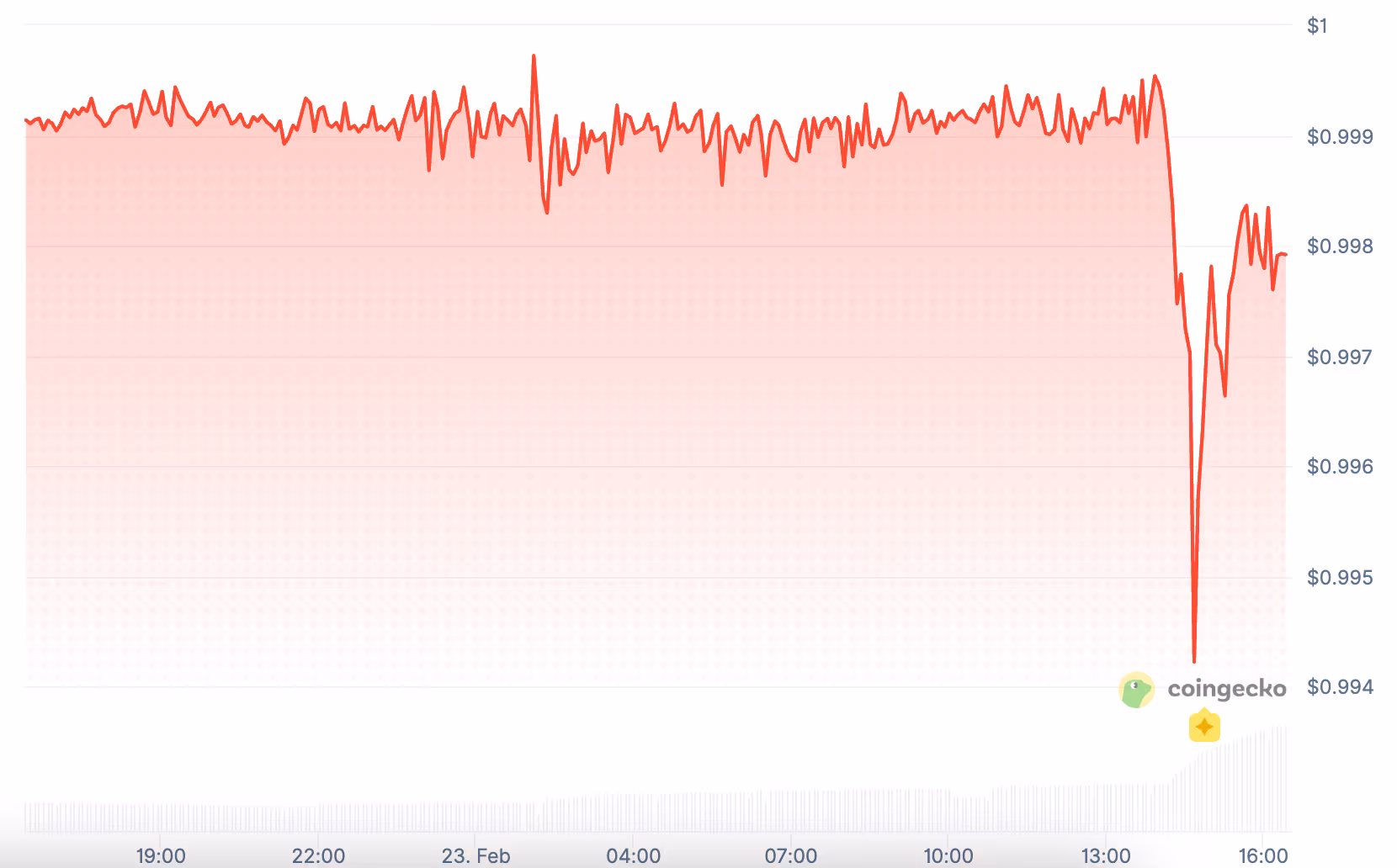 - USD1 dropped to a low of $0.994 (0.6% below peg) before bouncing back to approximately $0.998.